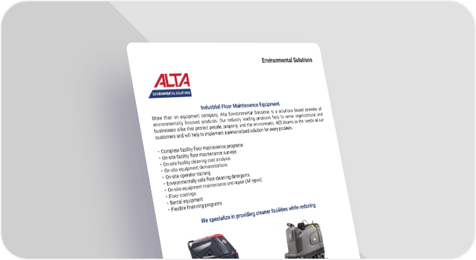 55 mh � altg � com Environmental Solutions Industrial Floor Maintenance Equipment More than an equipment company, Alta Environmental Solutions is a solutions based provider of environmentally focused products � Our industry leading products help to serve organizations and businesses alike that protect people, property, and the environment � AES listens to the needs of our customers and will help to implement a personalized solution for every problem � • Complete facility floor maintenance programs • On-site facility floor maintenance surveys • On-site facility cleaning cost analysis • On-site equipment demonstrations • On-site operator training • Environmentally safe floor cleaning detergents • On-site equipment maintenance and repair (All types) • Floor coatings • Rental equipment • Flexible financing programs We specialize in providing cleaner facilities while reducing