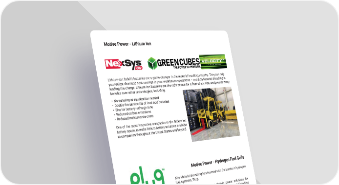 70 mh�altg�com Motive Power - Lithium Ion One of the most innovative companies in the lithium-ion battery space, to make lithium battery solutions available to companies throughout the United States and beyond � Lithium-ion forklift batteries are a game-changer in the material handling industry � They can help you realize dramatic cost savings in your warehouse operations – and Alta Material Handling is leading the charge. Lithium-ion batteries are the right choice for a fleet of any size, and provide many benefits over other technologies, including: • No watering or equalization needed • Double the service life of lead acid batteries • Shorter battery recharge time • Reduced carbon emissions • Reduced maintenance costs Motive Power - Hydrogen Fuel Cells Alta Material Handling has teamed with the leader in hydrogen fuel systems, Plug � Plug’s GenDrive fuel cells are drop-in power solutions for existing electric Class 1, Class 2 and Class 3 material handling electric truck fleets. This zero-emission power source for electric lift trucks is a high-productivity alternative to lead acid batteries � They eliminate the need for battery handling, charging, and swapping, and are easily installed and quickly and conveniently refueled � Alta Material Handling provides turn-key hydrogen fuel cell solutions � From initial system engineering and design to fuel delivery and aftermarket maintenance and service �