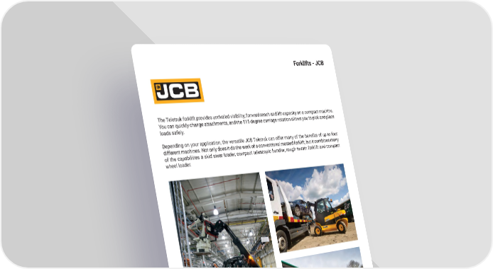 43 mh � altg � com Forklifts - JCB The Teletruk forklift provides unrivaled visibility, forward reach and lift capacity on a compact machine � You can quickly change attachments, and the 111-degree carriage rotation allows you to pick and place loads safely � Depending on your application, the versatile JCB Teletruk can offer many of the benefits of up to four different machines � Not only does it do the work of a conventional masted forklift, but it combines many of the capabilities a skid steer loader, compact telescopic handler, rough terrain forklift and compact wheel loader �