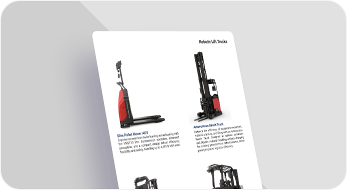 9 mh � altg � com Robotic Lift Trucks Autonomous Reach Truck Enhance the efficiency of equipment movement, material stacking, and lifting with an Autonomous Reach Truck � Designed to achieve automatic and flexible material handling without changing the existing procedures or infrastructures, which greatly improves logistics efficiency. Slim Pallet Mover AGV Experience seamless trailer loading and unloading with the VNST20 Pro � Autonomous operation, advanced perception, and a compact design deliver efficiency, flexibility and safety, handling up to 4,409 lb with ease. Counterbalance Truck The counterbalance truck AGV/AMR is designed to efficiently achieve indoor and outdoor automatic material handling, material loading and unloading, in and out � Counterbalance Stacker The counterbalance stacker AGV/AMR designed to achieve automatic and flexible material handling, material inbound and outbound, greatly improving logistics efficiency.