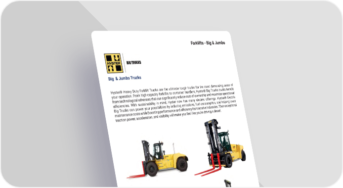 37 mh � altg � com Forklifts - Big & Jumbo Big & Jumbo Trucks Hyster® Heavy Duty Forklift Trucks are the ultimate tough trucks for the most demanding areas of your operation. From high-capacity forklifts to container handlers, Hyster® Big Trucks trucks benefit from technological advances that can significantly reduce cost of ownership and maximize operational efficiencies. With sustainability in mind, Hyster now has many electric offerings. Hyster® Electric Big Trucks can power your possibilities by reducing emissions, fuel consumption, and helping lower maintenance costs while boosting performance and efficiency for intensive industries. Their exceptional traction power, acceleration, and visibility will make you feel like you’re driving a diesel �