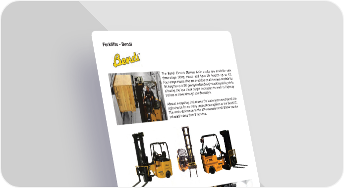 50 mh�altg�com Forklifts - Bendi The Bendi Electric Narrow Aisle trucks are available with three-stage tilting masts and have lift heights up to 41’ � Four-stage masts also are available on all 4-wheel models for lift heights up to 26’ giving the Bendi high stacking ability while allowing the low mast height necessary to work in highway trailers or travel through low doorways � Almost everything that makes the battery-powered Bendi the right choice for so many applications applies to the Bendi IC � The main difference is the LP-Powered Bendi B40i4 can be refueled in less than 5 minutes � The Bendi B40AC-DR and the B50AC-DR deep reach forklift can stack pallets double deep from 8’ aisles � It has lift heights of 425” and a 3,000 lb � capacity in the second deep position �