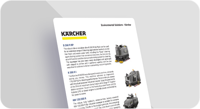 57 mh � altg � com Environmental Solutions - Kärcher KM 130/300 R The robust, fully hydraulic, emission-free, battery powered KM 130/300 R Bp industrial sweeper is suitable for extreme cleaning jobs. Thanks to the dustpan principle, fine sweepings and coarse dirt are vacuumed � The roller brush automatically adjusts to uneven surfaces and the innovative sweeping system reduces wear and tear to a minimum � B 300 R I The Kärcher B 300 R I was designed to save you time, ultimately saving you money � This machine achieves an impressive 178,144 ft2/hr cleaning performance � Scrub while you sweep with this dual-purpose industrial cleaner � Enjoy the practicality of the 59-inch maximum dump height of the large 47 � 5-gallon debris container � Count on the heavy-duty steel frame and the Kubota LPG or diesel engine to provide power and reliability for years to come � KM 75/40 R The KM 75/40 R is the pinnacle of commercial-duty sweepers � Coming standard with maintenance free AGM batteries and an onboard charging system, the KM 75/40 W Bp is self-propelled, traveling up to 2 � 8 MPH, and can climb inclines up to 12% � The standard filter system is 99.5% efficient, preventing fine dust particles from re-entering the environment by utilizing a large suction fan and synthetic pleated filter. B 260 R BP The robust ride-on scrubber drier B 260 RI Bp Pack can be used for an extensive range of cleaning applications thanks to its 260 liter fresh and waste water tank, including the “Dose” cleaning agent dosing system that conserves resources, the time-saving auto-fill function and the manual tank rinsing system for cleaning. The squeegee has also been newly developed and optimized with respect to airflow and it performs superbly with the two wear-free Ec turbines to deliver outstanding vacuuming results �