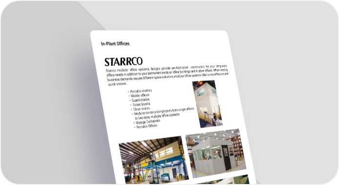 22 mh�altg�com In-Plant Offices Starrco modular office systems designs provide pre-fabricated construction for your temporary office needs in addition to your permanent modular office buildings and in-plant offices. When varying business demands require different space solutions, modular office systems offer a cost-effective and quick answer � • Portable shelters • Mobile offices • Guard shacks • Ticket booths • Clean rooms • Modular construction projects from single offices to two-story multiple office systems • Storage Containers • Portable Offices