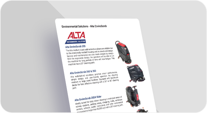 56 mh�altg�com Environmental Solutions - Alta EnviroScrub Alta EnviroScrub 28DR Rider Ideally suited for daily indoor cleaning in mid-sized areas of railway stations, parking areas, shopping malls, exhibition centers, schools, public institutions and other commercial environments larger than 50,000 sq ft with a 28” cleaning path � Alta EnviroScrub 26D & 30D Alta walk-behind scrubbers prioritize smart performance, simple design, and user-friendly operation for cleaning medium to large sized facilities � Equipped with dual-brush decks for fast, effective cleaning with a 26” or 30” cleaning path � Alta EnviroScrub 39DR Rider Designed with truly massive floor space in mind, the 39DR is Alta’s largest ride-on scrubber, but don’t let the size fool you – it’s still compact and maneuverable, and built with safety, productivity, and resource-efficiency in mind. Your staff will appreciate intuitive controls and simple operation, along with a smart and durable design & a 39” cleaning path � Alta EnviroScrub 20D The Alta medium sized walk-behind scrubbers are reliable due to the rotationally molded housing and its structured design � Service and maintenance are also made simpler by design � With the ergonomic design, the operators will be able to run the machine for long periods of time with less fatigue � This machine has a 20” cleaning path �