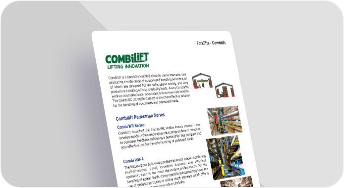 45 mh � altg � com Combilift is a specialty forklift & straddle carrier manufacturer producing a wide range of customized handling solutions, all of which are designed for the safe, space saving, and very productive handling of long and bulky loads � 4-way Combilifts work as counterbalance, sideloader, and narrow-aisle forklifts � The Combi-SC (Straddle Carrier) is the cost-effective solution for the handling of containers and oversized loads � Combi WR Series Combilift launched the Combi-WR Walkie Reach stacker - the smallest model in the company’s product range to date - in response to customer feedback indicating a demand for this compact and cost effective unit for the safe handling of palletized loads � Combi WR-4 The first purpose built 4-way pedestrian reach stacker combining multi-directional travel, innovative features, and effortless operation, even in the most demanding environments � For the handling of lighter loads, many operations increasingly favor the use of pedestrian trucks or walkie reach stackers which offer a number of advantages over ride-on forklifts � Combi CS Safety was a chief consideration for the Combi-CS � The multi-position tiller enables push-button rotation of the rear wheel, allowing the operator to remain in the safest possible position when placing and picking in narrow aisles � Combi PPT Powerful, economical and thoughtfully-designed, Combilift’s Powered Pallet Truck is a highly versatile option, suitable for small to medium-sized warehouses and production facilities � Combilift Pedestrian Series Forklifts - Combilift