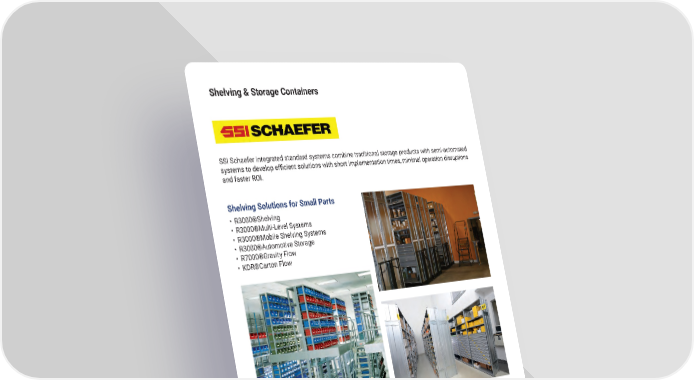17 mh � altg � com SSI Schaefer integrated standard systems combine traditional storage products with semi-automated systems to develop efficient solutions with short implementation times, minimal operation disruptions and faster ROI � Shelving & Storage Containers Shelving Solutions for Small Parts • R3000®Shelving • R3000®Multi-Level Systems • R3000®Mobile Shelving Systems • R3000®Automotive Storage • R7000®Gravity Flow • KDR®Carton Flow Storage Container Solutions • Straight Wall Containers • Stack & Nest Containers • Automatic Systems Containers • Storage Bins