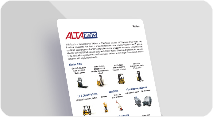 75 mh � altg � com Rentals With locations throughout the Midwest and Northeast and over 15,000 pieces of late model, safe, & reliable equipment, Alta Rents is a true single source rental provider � With have over 87 years of combined experience we offer the best rental equipment and service at extremely competitive rates � We offer 2,000-120,000 lb capacity equipment utilizing electric, LPG, diesel, & gas power � We specialize in the hard to find equipment you need to keep your business working for you. Our rental staff is here to serve you with all your rental needs � Electric Lifts Electric Pallet Jacks 4,000 lb-8,000 lb Walkie & Rider Walkie Stackers 2,000 lb-4,000 lb Straddle, Counter Balance & Reach Narrow Aisle Order Selectors, Reach & Deep Reach Electric Riders 3,000 lb - 30,000 lb Pneumatic & Cushion LP & Diesel Forklifts LP/Diesel Pneumatic, Cushion Floor Cleaning Equipment Aerial Lifts Boom Lifts 30’ to 60’ Electric, Scissors Ride On Sweeper Walk Behind Scrubbers Heavy Lifting Equipment Versa-lift 25,000 lb- Sellick S Series Specialty Equipment Mariotti 1,763 lb to 2,341 lb CombiLift 6,000 lb to 10,000 lb Drexel /Bendi Motrec Carts Landoll Hyster * Available brands