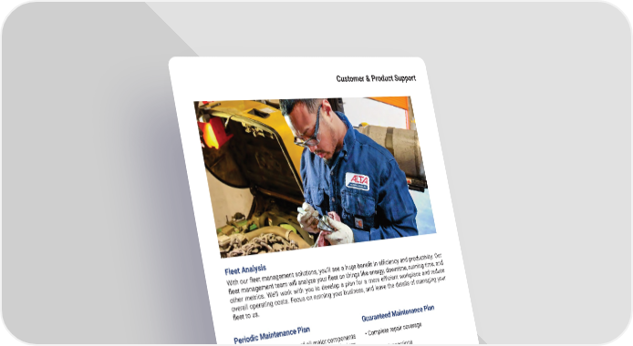 73 mh � altg � com Customer & Product Support Fleet Analysis With our fleet management solutions, you’ll see a huge benefit in efficiency and productivity. Our fleet management team will analyze your fleet on things like energy, downtime, running time, and other metrics. We’ll work with you to develop a plan for a more efficient workplace and reduce overall operating costs � Focus on running your business, and leave the details of managing your fleet to us. • Professional inspection of all major components and systems, including fluids and safety devices • Written report detailing current condition of each unit Flexible, reliable scheduling • Two-hour guaranteed response time Guaranteed Maintenance Plan • Complete repair coverage • Regular inspections • Highly-trained service technicians • 48-hour loaner guarantee • One monthly invoice • Guaranteed service response time • Parts, labor, supplies, travel time included • Free program estimates for your existing fleet Periodic Maintenance Plan