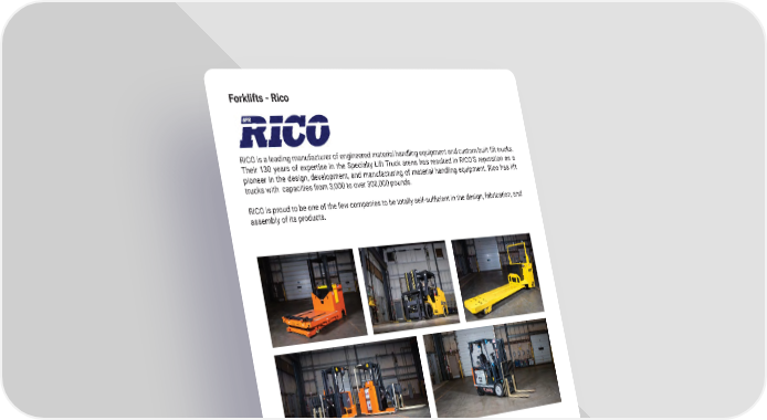 40 mh�altg�com Forklifts - Rico RICO is a leading manufacturer of engineered material handling equipment and custom built lift trucks � Their 130 years of expertise in the Specialty Lift Truck arena has resulted in RICO’S reputation as a pioneer in the design, development, and manufacturing of material handling equipment � Rico has lift trucks with capacities from 3,000 to over 300,000 pounds � RICO is proud to be one of the few companies to be totally self-sufficient in the design, fabrication, and assembly of its products �