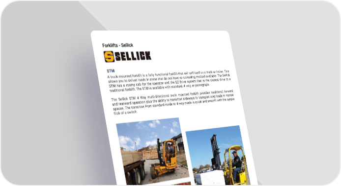 42 mh�altg�com STM A truck mounted forklift is a fully functional forklift that will self-load on a truck or trailer � This allows you to deliver loads in areas that do not have an unloading method available � The Sellick STM has a roomy cab for the operator and the EZ Drive system that is the closest drive to a traditional forklift � The STM is available with standard, 4 way, or pantograph � The Sellick STM 4 Way multi-directional truck mounted forklift provides traditional forward and rearward operation plus the ability to transition sideways to transport long loads in narrow spaces � The transition from standard mode to 4 way mode is quick and smooth with the simple flick of a switch � Forklifts - Sellick