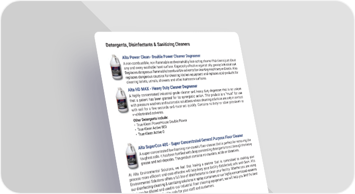62 mh�altg�com Detergents, Disinfectants & Sanitizing Cleaners At Alta Environmental Solutions, we feel that having a partner that is committed to making your process more efficient and cost-effective will help keep your facility disinfected, safe and clean. Alta Environmental Solutions offers a full line of disinfectants to clean your facility � Whether you are using our disinfecting cleaning & sanitizing solutions in spray containers or our highly concentrated versions that can be diluted and used in our industrial floor cleaning equipment, we will help you find the best solution to keep your facility safe for your staff and customers � AirX Spray n’ Go Disinfectant Cleaner • Kills 99 � 9% of bacteria in 5 seconds • Kills micro-organisms on soft services • Cleans and disinfects hard non porous surface and much more ��� AirX Rx-44ACE • Kills 99 � 9% of bacteria in 5 seconds • Kills micro-organisms on soft services • Cleans and disinfects hard non porous surfaces and much more ��� True-Kleen KLEEN-64 Disinfectant Cleaner One step disinfectant cleaner that is effective against a broad spectrum of bacteria, is virucidal & fungicidal when used as directed � Alta Power Clean- Double Power Cleaner Degreaser A non-combustible, non-flammable and remarkably fast-acting cleaner that cleans just about any and every washable hard surface � Especially effective against oily, greasy industrial soil � Replaces dangerous flammable/combustible solvents for cleaning machinery and tools. Also replaces dangerous caustics for cleaning kitchen equipment and replaces acid products for cleaning toilets, urinals, showers and other bathroom surfaces � Alta HD MAX - Heavy Duty Cleaner Degreaser A highly concentrated industrial grade cleaner and heavy duty degreaser that is so unique that a patent has been granted for its synergistic action � This product is a “must” for use with pressure washers and automatic scrubbers where cleaning solutions are only in contact with soil for a few seconds and must act quickly � Contains no butyl or other petroleum or ++chlorinated solvents � Other Detergents include: • True-Kleen PowerHouse Double Power • True-Kleen Active 800 • True-Kleen Active O Alta SuperCon 400 - Super Concentrated General Purpose Floor Cleaner A super concentrated low foaming non-caustic floor cleaner that is perfect for removing the toughest soils. It has been fortified with deep penetrating detergents to cut through the heavy grease and soil deposits � This product contains no caustics, acids or abrasives �