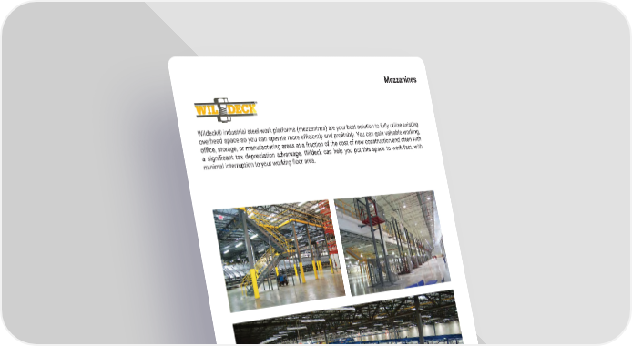 21 mh � altg � com Mezzanines Wildeck® industrial steel work platforms (mezzanines) are your best solution to fully utilize existing overhead space so you can operate more efficiently and profitably. You can gain valuable working, office, storage, or manufacturing areas at a fraction of the cost of new construction and often with a significant tax depreciation advantage. Wildeck can help you put this space to work fast, with minimal interruption to your working floor area.