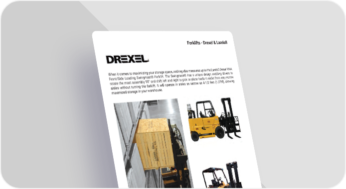 49 mh � altg � com Forklifts - Drexel & Landoll When it comes to maximizing your storage space, nothing else measures up to the Landoll Drexel VNA Front/Side Loading Swingmast® Forklift � The Swingmast® has a unique design enabling drivers to rotate the mast assembly 90° and shift left and right to pick or place loads in racks from very narrow aisles without turning the forklift � It will operate in aisles as narrow as 4-1/2 feet (1 � 37M), allowing maximized storage in your warehouse �