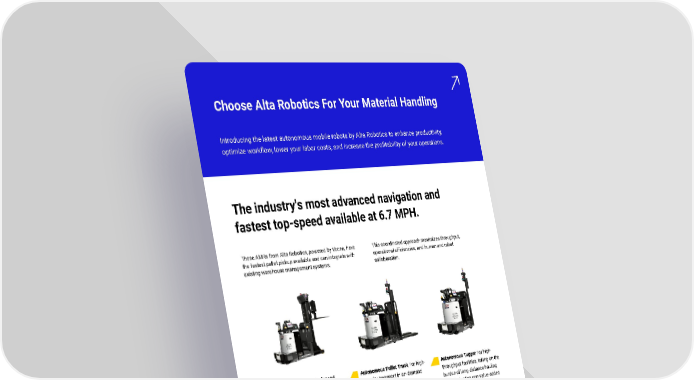 Choose Alta Robotics For Your Material Handling Introducing the latest autonomous mobile robots by Alta Robotics to enhance productivity, optimize workflow, lower your labor costs, and increase the profitability of your operations. The industry's most advanced navigation and fastest top-speed available at 6.7 MPH. These AMRs from Alta Robotics, powered by Vecna, have This coordinated approach maximizes throughput, the fastest pallet pickup available and can integrate with operational efficiencies, and human and robot existing warehouse management systems. collaboration. Autonomous Counterbalanced Autonomous Pallet Truck For high- Autonomous Tugger For high- Fork Truck Versatile and efficient, capacity transport in on-demand throughput facilities, taking on the and can move a wide range of lineside replenishment, long burden of long-distance hauling payloads and pallet types, lift to distance high-throughput hauling, and eliminating non-value-added conveyor belts, and work alongside and non-conveyable transport at travel for material handling other material handling equipment. sortation hubs. equipment operators. High Reach, More Payload Advanced Pallet Handling High Speed, High Capacity Reach up to 72" with a payload Handle a variety of pallets with Transport more and faster with of up to 3,000 lbs. or without bottom boards. trains up to 10,000 lbs. Versatile Pallet Handling Multi-Pallet Hauling Adaptable to Workflows Handle a variety of pallet payloads, Take on double-stacked pallets Retool or refine paths and from empty to full. up to 8,000 lbs. destinations quickly. Integrated Handoffs Task Interleaving Flexible Configurations Lift to and from conveyors, Replan missions in real-time to Tow a variety of carts at varying wrappers, carts, and more. optimize forks-full efficiency. train lengths.