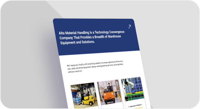 Alta Material Handling Is a Technology Convergence Company That Provides a Breadth of Warehouse Equipment and Solutions. We’ll equip your facility with everything needed to increase operational e昀케ciencies: new, used, and rental equipment, design and engineering services, and proprietary software solutions. Conventional Electri昀椀cation Automation & Robotics • Warehouse Lift Trucks • Lead Acid Batteries • Conveyor • Outdoor Lift Trucks • Lithium-Ion Batteries • Sortation • Specialized Lift Equipment • Hydrogen Fuel Cells • Automated Storage & Retrieval • Aerial Lift Equipment • Solid State Charging Systems System (AS/RS) • Burden & Personal Carriers • Low Speed Vehicles • Packaging & Labeling • E nvironmental Cleaning • R emote Monitoring & Diagnostic • Pick-To-Light Equipment Platforms • Automated Guided Vehicles • In-Plant Safety Systems • Autonomous Mobile Robots • Rack & Shelving Systems • Warehouse Management Software (WMS) PAGE 03