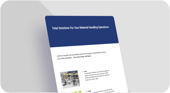 Total Solutions For Your Material Handling Operations Achieve increased and sustainable productivity, throughput, and pro昀椀tability using our LES is More philosophy – less Labor, Energy, and Space. Labor Our automated solutions touch nearly every aspect of supply chain operations, product transport, sorting, picking, distribution, and even cleaning to improve all facets of your labor usage. Energy Our primary goal is to provide our customers with the safest and most e昀케cient energy solutions on the market, while also meeting your budgetary and operational needs. Space Our space solutions will help you optimize every square inch of your building, with customizable, tailor-made vertical and horizontal solutions. PAGE 02