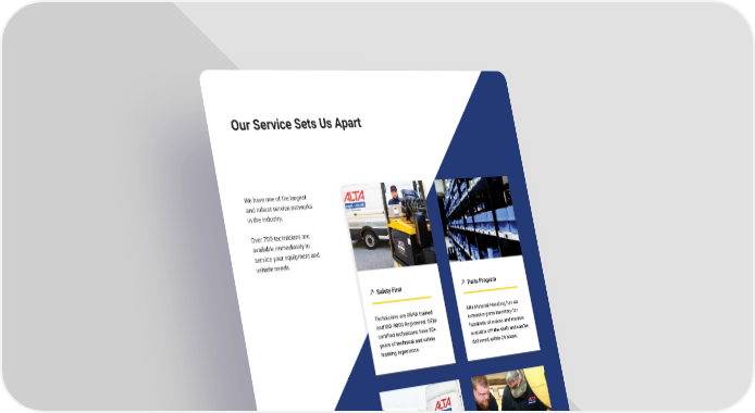 Our Service Sets Us Apart We have one of the largest and robust service networks in the industry. Over 700 technicians are available immediately to service your equipment and vehicle needs. Safety First Parts Program Technicians are OSHA trained Alta Material Handling has an and ISO-9000 Registered. OEM- extensive parts inventory for certified technicians have 50+ hundreds of makes and models years of technical and safety available off the shelf and can be training experience. delivered within 24 hours. 24 Hour Service Full Service Highly competent service team Custom service and maintenance supported by continually trained programs generate an average network of dealers helps ensure of 15% savings on customers’ fast and reliable service repairs. operating fleet costs. PAPAGGEE 0 066